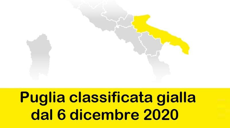 La Puglia passa in zona gialla. Dopo il Dpcm firmato il 3 dicembre scorso dal presidente del Consiglio dei Ministri, Giuseppe Conte, e dal Ministro della salute, Roberto Speranza, il titolare di quest’ultimo dicastero ha firmato anche l’ordinanza che classifica la nostra regione come gialla. Questo significa che si allargano un po’ le maglie delle restrizioni legate all’emergenza sanitaria e all’azione di contenimento del Coronavirus. Ma vediamo cosa cambia con l’ingresso in zona gialla, a partire da domenica 6 dicembre 2020. Ecco il contenuto di alcune delle misure previste:
