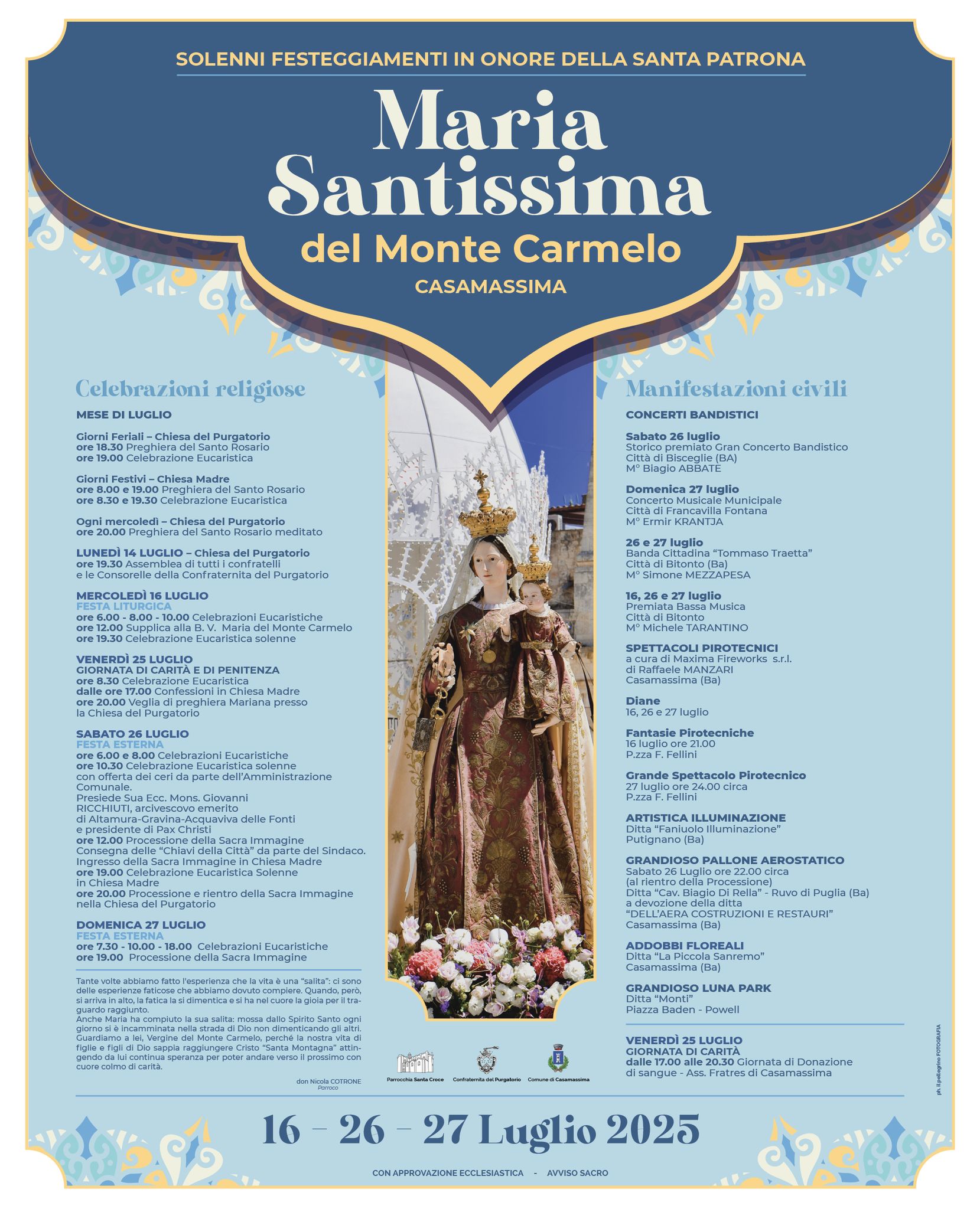 - per la serata di sabato 26 Luglio: lo “Storico premiato Gran Concerto bandistico” a cura della banda della Città di Bisceglie diretta dal maestro Biagio Abbate.